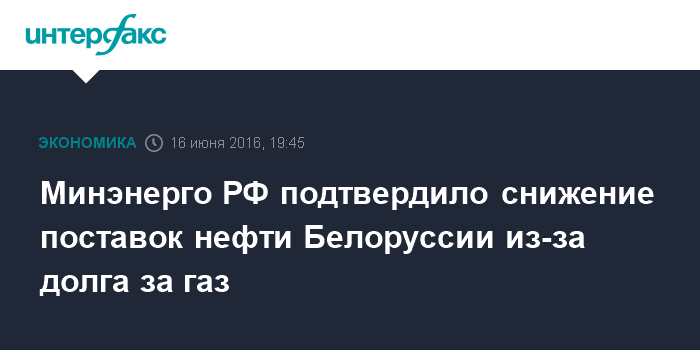 Москва. 16 июня. INTERFAX.RU - Минэнерго России признало, что российская сторона сокращает поставки нефти в Белоруссию в связи с долгами за российский газ.