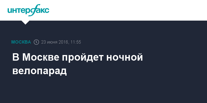 Москва. 23 июня. INTERFAX.RU - Второй ночной Московский велопарад в поддержку развития велоинфраструктуры и за безопасность на дорогах пройдет в субботу, 2 июля, сообщили "Интерфаксу" в пресс-службе департамента транспорта столицы в четверг.