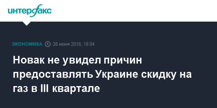 Москва. 28 июня. INTERFAX.RU - Цена на газ для Украины в третьем квартале, по предварительным оценкам, будет не выше рыночной, что не потребует предоставления скидок, сообщил министр энергетики РФ Александр Новак в интервью телеканалу "Россия-24" (ВГТРК).
