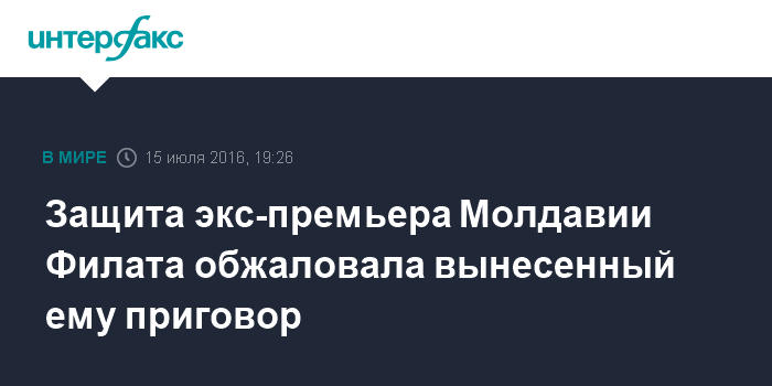 Москва. 15 июля. INTERFAX.RU - Адвокаты бывшего премьер-министра Молдавии Влада Филата, получившего 9 лет лишения свободы по делу о коррупции и извлечении выгоды из влияния, направили жалобу на вынесенный ему приговор.