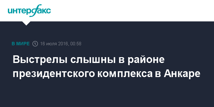 Москва. 16 июля. INTERFAX.RU - Очевидцы сообщают о выстрелах в районе президентского комплекса в Анкаре, сообщает в Twitter агентство Anadolu.