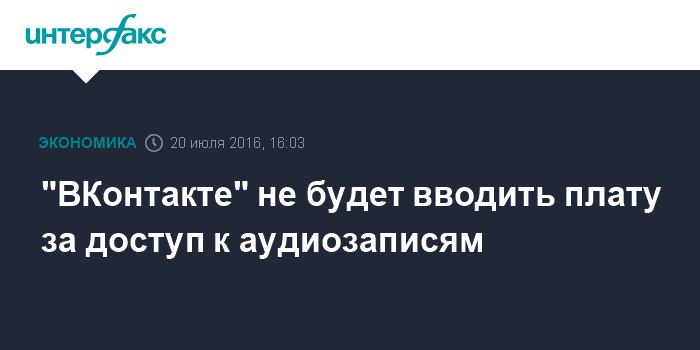 Москва. 20 июля. INTERFAX.RU - Социальная сеть "Вконтакте" (принадлежит Mail.ru Group) не планирует вводить плату за доступ к аудиозаписям в мобильном приложении и на десктопе, сообщили в пресс-службе соцсети.