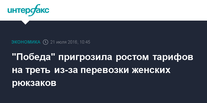 Москва. 21 июля. INTERFAX.RU - Лоукостер "Победа" пригрозил увеличить вдвое минимальный тариф на свои услуги если апелляция не изменит вынесенного ранее решения суда, пишут в четверг "Ведомости". Согласно изданию, речь идет об иске "Победы" к Ространснадзору в котором перевозчик требовал отменить предписание ведомства о бесплатной перевозке в салоне женских рюкзачков.