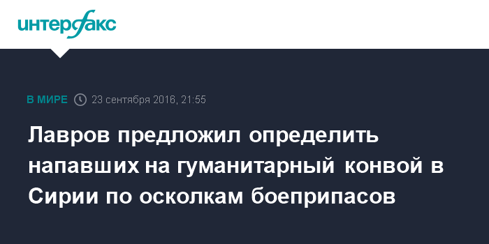 Москва. 23 сентября. INTERFAX.RU - Глава МИД РФ Сергей Лавров заявил о необходимости найти осколки боеприпасов, которые использовали для атаки на гуманитарный конвой в Сирии, для выявления совершивших нападение.