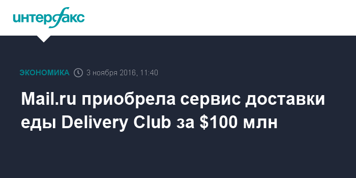 Москва. 3 ноября. INTERFAX.RU - Mail.Ru Group приобрела 100% сервиса заказа и доставки еды Delivery Club за $100 млн, говорится в сообщении холдинга. Соглашение о сделке стороны подписали в четверг.