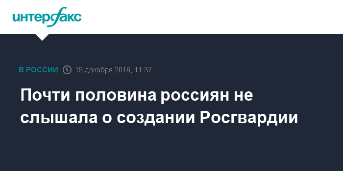 Москва. 19 декабря. INTERFAX.RU - Чуть менее половины россиян оказались не в курсе создания Росгвардии, сообщил гендиректор ВЦИОМ Валерий Федоров.