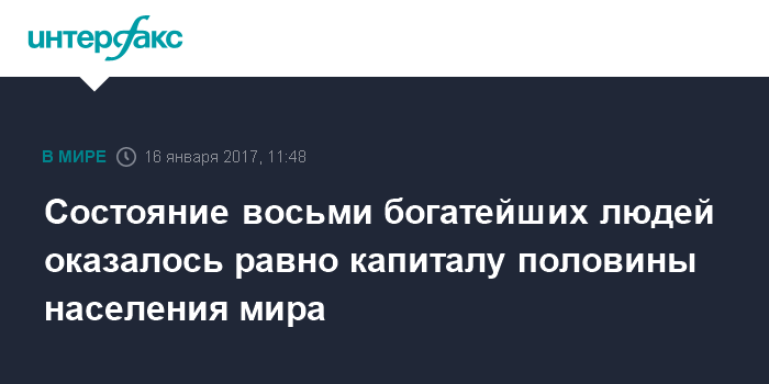 Москва. 16 января. INTERFAX.RU - Восемь самых богатых людей в мире обладают таким же состоянием, как 3,6 млрд человек, говорится в отчете неправительственной организации Oxfam, занимающейся борьбой с бедностью.