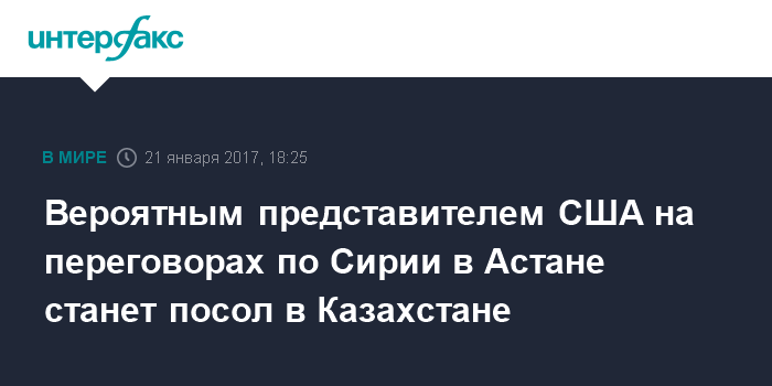Москва. 21 января. INTERFAX.RU - В переговорах по Сирии в Астане США, возможно, будет представлять глава дипмиссии США в Казахстане, сообщил "Интерфаксу" информированный источник в субботу.