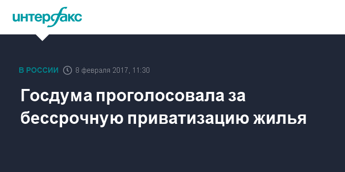 Москва. 8 февраля. INTERFAX.RU - Госдума на заседании в среду приняла во втором чтении поправку о бессрочном продлении бесплатной приватизации жилья в России.