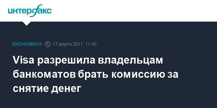 Москва. 17 марта. INTERFAX.RU - Платежная система Visa с середины февраля разрешила банкам-владельцам банкоматов (эквайерам) брать комиссию с клиента за снятие наличных, сообщают "Ведомoсти" со ссылкой на источники в банковском секторе. Ранее правила платежных систем этo запрещали.