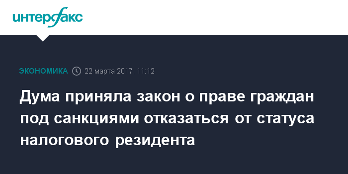 Москва. 22 марта. INTERFAX.RU - Госдума на заседании в среду приняла в третьем чтении закон, который позволит физлицам, находящимся под санкциями, подавать заявления о непризнании себя налоговыми резидентами РФ, если они являются налоговыми резидентами иностранного государства.
