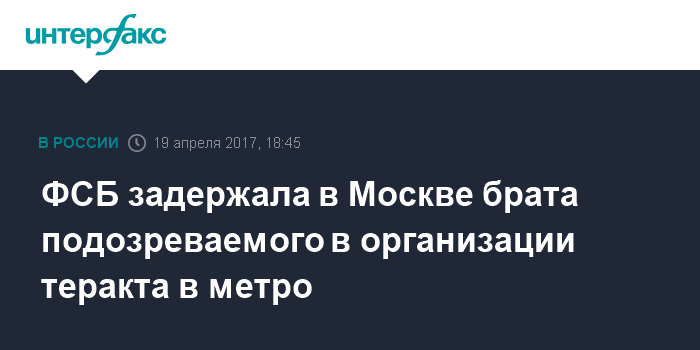 Москва. 19 апреля. INTERFAX.RU - ФСБ сообщила о задержании в Москве старшего брата одного из организаторов теракта в метро Санкт-Петербурга Аброра Азимова, а также рассказало о его роли в подготовке взрыва.