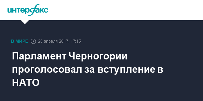 Москва. 28 апреля. INTERFAX.RU - Депутаты скупщины Черногории в пятницу проголосовали по вопросу о вступлении страны в НАТО, сообщает радио и телевидение Черногории.