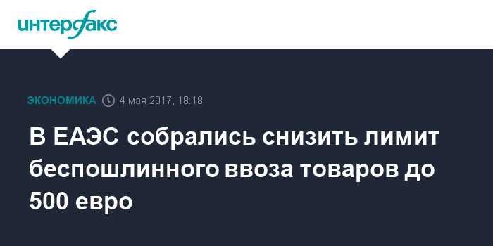 Москва. 4 мая. INTERFAX.RU - Норма беспошлинного ввоза товаров физлицами для личных целей наземными видами транспорта в Евразийском экономическом союзе (ЕАЭС) может быть снижена втрое - с 1500 до 500 евро, следует из проекта документа, опубликованного Евразийской экономической комиссией (ЕЭК).