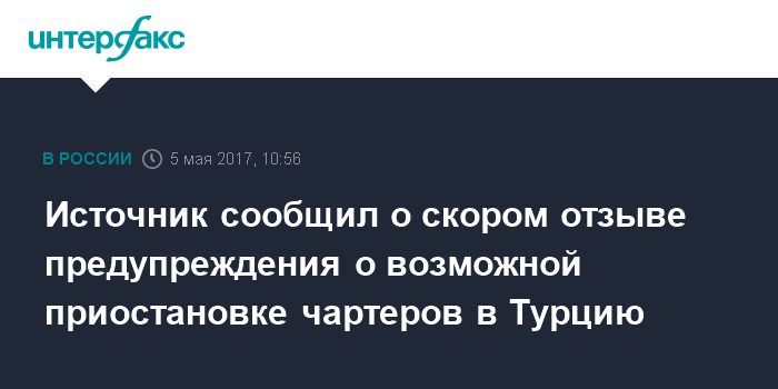 "Ожидаем, что предупреждение о возможной приостановке чартерного авиасообщения с Турцией будет официально отозвано сегодня до конца дня", - сказал источник.