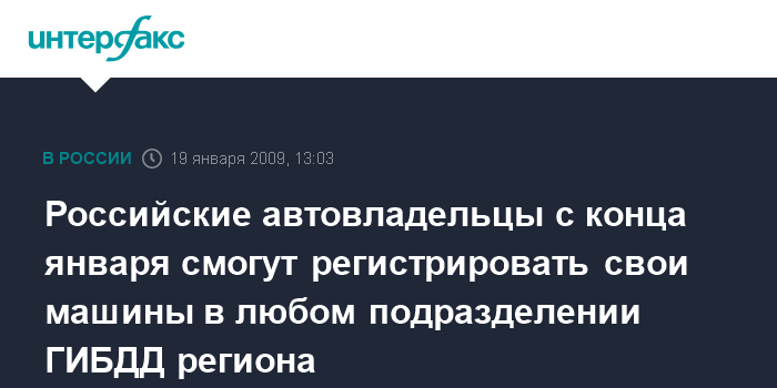 Москва. 19 января. INTERFAX.RU - Новые правила регистрации автомашин, которые позволят ставить автомобили на учет в любом подразделении ГИБДД в пределах региона, вступят в силу в конце января.
