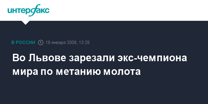 Москва. 19 января. INTERFAX.RU – Бывшего чемпиона мира по метанию молота 53-летнего Юрия Заболотного зарезали в его собственной квартире в райцентре Яворов Львовской области.