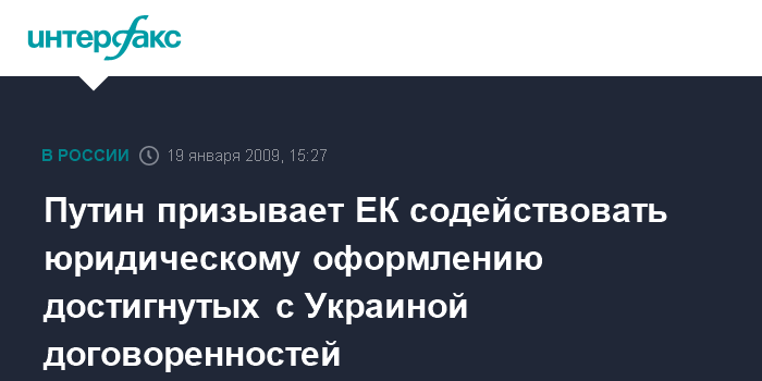 Москва. 19 января. INTERFAX.RU - Премьер-министр РФ Владимир Путин провел телефонный разговор с председателем Комиссии европейских сообществ Жозе Мануэлом Баррозу, в котором призвал Еврокомиссию содействовать юридическому оформлению достигнутых с Украиной договоренностей по газовой проблеме.