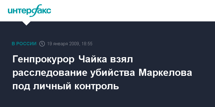 Москва. 19 января. INTERFAX.RU - Генеральный прокурор России Юрий Чайка взял под личный контроль расследование убийства адвоката Станислава Маркелова.