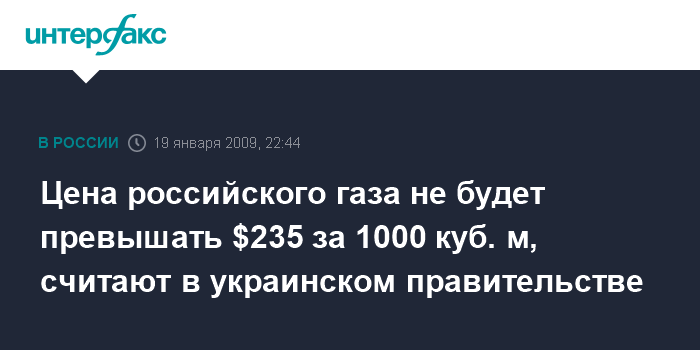 Киев. 19 января. ИНТЕРФАКС-УКРАИНА - Утвержденный формульный расчет цены поставок российского газа позволяет оценить его среднегодовую цену для Украины в 2009 году на уровне до $235 за 1000 куб. м, сообщил украинский вице-премьер Григорий Немыря.