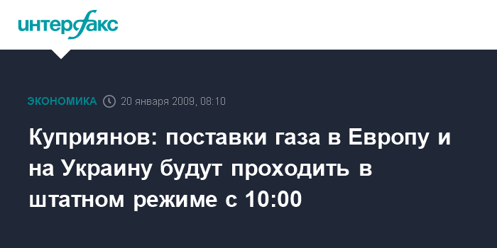 Москва. 20 января. INTERFAX.RU - Поставки газа в Европу и на Украину будут проходить в штатном режиме с 10:00 мск вторника, заявил "Интерфаксу" официальный представитель ОАО "Газпром" Сергей Куприянов