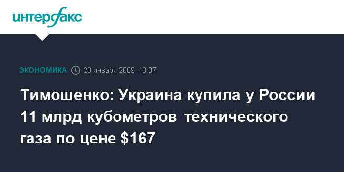 Москва. 20 января. INTERFAX.RU - Украина купила у России 11 млрд кубометров технического газа по цене $167, сообщила премьер-министр Украины Юлия Тимошенко.