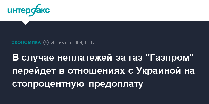 Москва. 20 января. INTERFAX.RU - В случае неплатежей за газ "Газпром" перейдет в отношениях с Украиной на стопроцентную предоплату, сообщил глава "Газпрома" Алексей Миллер на встрече с президентом РФ Дмитрием Медведевым во вторник.