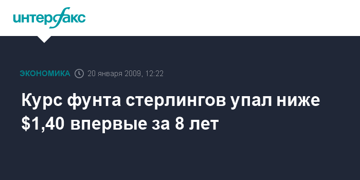 Лондон. 20 января. INTERFAX.RU - Курс национальной валюты Великобритании обвалился ниже $1,40 впервые с июля 2001 года на ожиданиях негативной статистики, сообщает агентство Bloomberg.