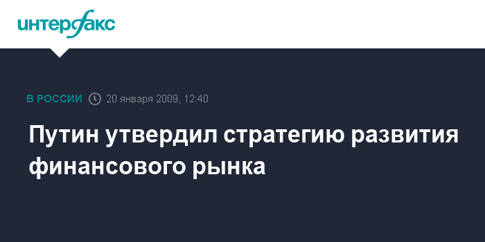 Москва. 20 января. INTERFAX.RU - Председатель правительства России Владимир Путин своим распоряжением утвердил Стратегию развития финансового рынка Российской Федерации на период до 2020 года, сообщила пресс-служба правительства РФ.
