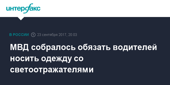 Москва. 23 сентября. INTERFAX.RU - МВД РФ намерено обязать водителей носить светоотражающую одежду при ночных остановках за пределами населенных пунктов, говорится на сайте ведомства.
