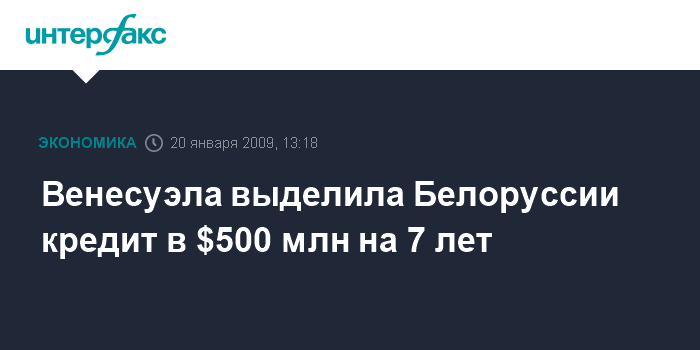 Минск. 20 января. INTERFAX.RU - Госкредит Венесуэлы на $500 млн выделен Белоруссии сроком на 7 лет, сообщил агентству "Интерфакс" источник в правительственных кругах.