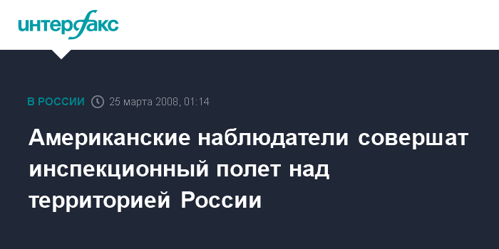 Москва. 25 марта. ИНТЕРФАКС-АВН - Группа американских инспекторов выполнит наблюдательный полет над территорией России в период с 25 по 29 марта в рамках международного договора "Открытое небо".