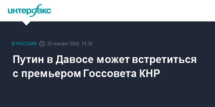 Пекин. 20 января. INTERFAX.Ru - Премьер-министр России Владимир Путин встретится с премьером Госсовета КНР Вэнь Цзябао на Всемирном экономическом форуме в Давосе, сообщил вице-премьер - министр финансов РФ Алексей Кудрин журналистам в Пекине во вторник.