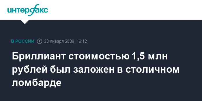 Москва. 20 января. INTERFAX.RU - В одном из столичных ломбардов был заложен бриллиант в 3,5 карата за 1,5 млн рублей, сообщил в интервью "Интерфаксу" руководитель ОАО Московского городского комбината ломбардов "Мосгорломбард" Вадим Каращук.