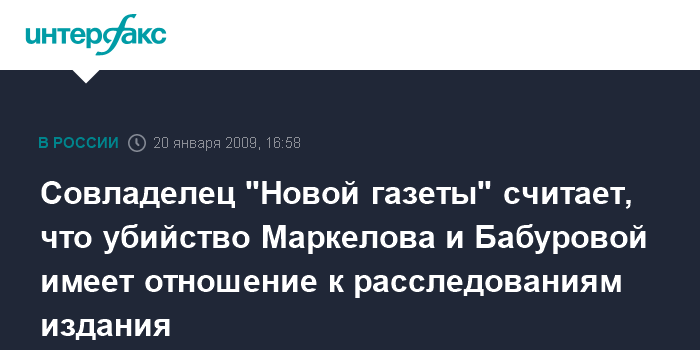 Москва. 20 января. INTERFAX.RU - Совладелец "Новой газеты" предприниматель Александр Лебедев уверен, что убийства адвоката Станислава Маркелова и журналистки Анастасии Бабуровой непосредственно связаны с журналистскими расследованиями этого издания.