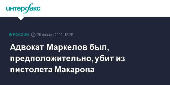 Москва. 20 января. INTERFAX.RU - Адвокат Станислав Маркелов был застрелен, вероятно, из пистолета Макарова, сообщил "Интерфаксу" источник в оперативно-следственной группе.