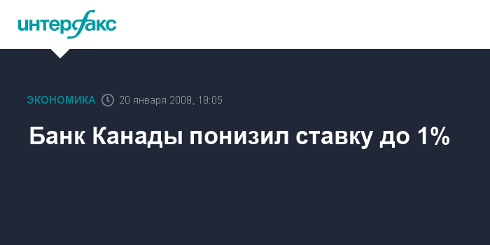 Оттава. 20 января. INTERFAX.RU - Банк Канады понизил во вторник базовую процентную ставку до 1% годовых - минимального уровня с момента основания банка в 1934 г., сообщает агентство Bloomberg.