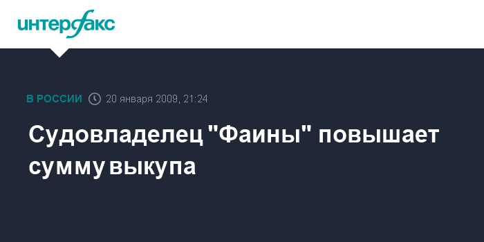 Киев. 20 января. INTERFAX.RU - Судовладелец захваченного пиратами судна "Фаина" решил увеличить сумму выкупа.
