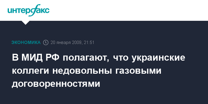 Москва. 20 января. INTERFAX.RU - В Москве расценивают заявление украинского МИД по газовой проблеме как проявление недовольства российско-украинскими соглашениями, достигнутыми в столице РФ