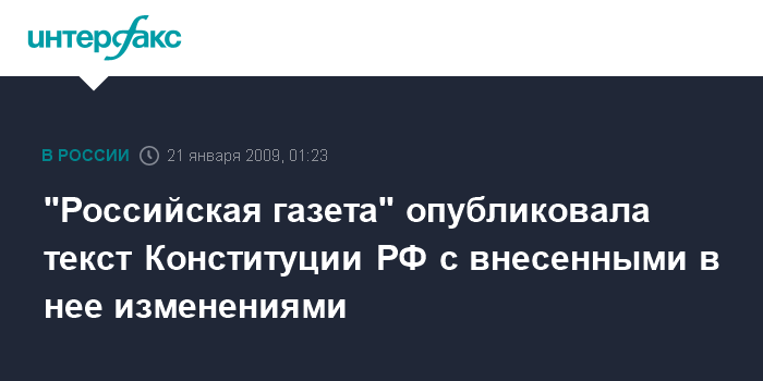 Москва. 21 января. ИНТЕРФАКС - Текст Конституции Российской Федерации с внесенными в конце 2008 года поправками опубликован 21 января в "Российской газете".
