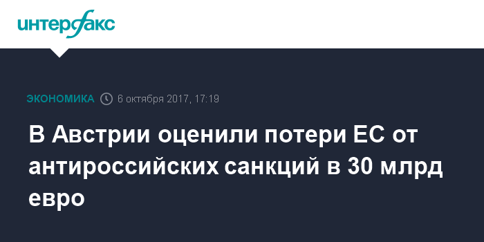 Москва. 6 октября. INTERFAX.RU - Антироссийские санкции с 2014 по 2016 год обошлись государствам Евросоюза в 30 млрд евро потерянного экспорта, говорится в докладе австрийского института экономических исследований (WIFO).