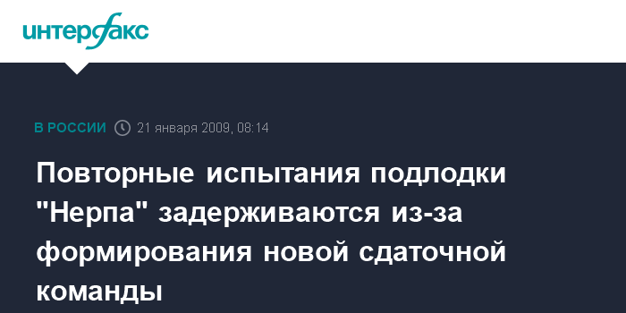 Хабаровск. 21 января. INTERFAX.RU - Испытания атомной подводной лодки "Нерпа", прерванные 8 ноября 2008 года из-за несанкционированного срабатывания системы пожаротушения и гибели 20 человек, откладываются на неопределенный срок из-за формирования новой команды.
