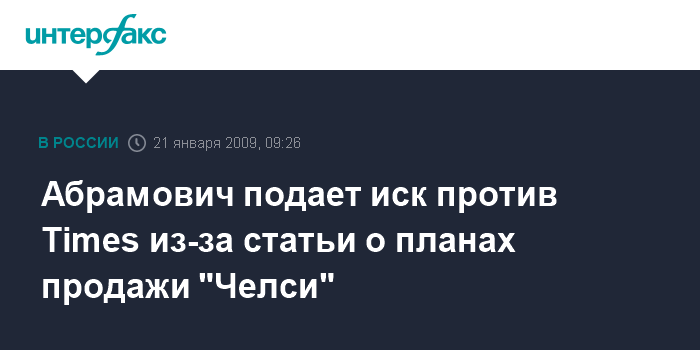 Лондон. 21 января. INTERFAX.RU - Предприниматель Роман Абрамович и принадлежащий ему футбольный клуб "Челси" подали иск против Times Newspapers Ltd., компании - издателя одноименной газеты, опубликовавшей статью о возможной продаже клуба.