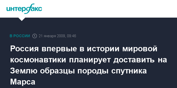 Москва. 21 января. INTERFAX.RU - Глава Роскосмоса Анатолий Перминов сообщил, что Россия в 2009 году отправит к Марсу космический аппарат для того, чтобы доставить на Землю породы со спутника Марса.