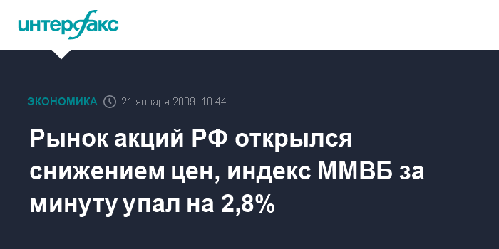 Рынок акций РФ открылся снижением цен, индекс ММВБ за минуту упал на 2,8%