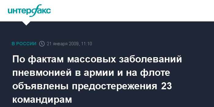 Москва. 21 января. INTERFAX.RU - Двум десяткам командиров и начальников Балтийского флота и Приволжско-Уральского военного округа объявлены предостережения, связанные с заболеванием пневмонией солдат-срочников в воинских частях, заявил начальник управления Главной военной прокуратуры генерал-майор юстиции Александр Никитин.