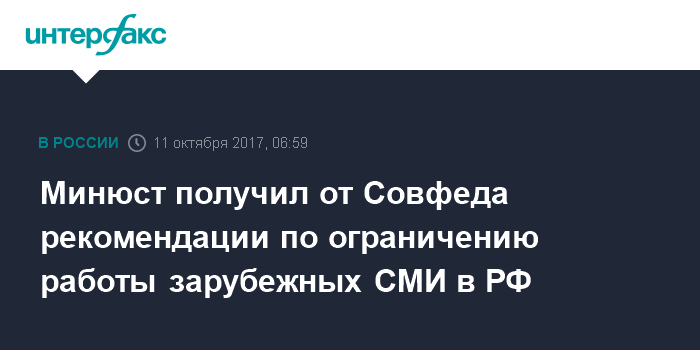 Москва. 11 октября. INTERFAX.RU - Минюст РФ изучит поступившие рекомендации Совета Федерации о разработке поправок, ограничивающих деятельность иностранных СМИ в России в ответ на притеснения российских журналистов за рубежом, сообщили в пресс-службе министерства.