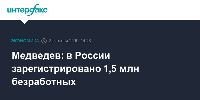 Горки. 21 января. INTERFAX.RU - Безработица в России, по сравнению с октябрем, выросла на 20% и составляет 1,5 млн человек, сообщил президент России Дмитрий Медведев на совещании с полпредами в федеральных округах. Мероприятие посвящено ситуации, которая сложилась на рынке труда.