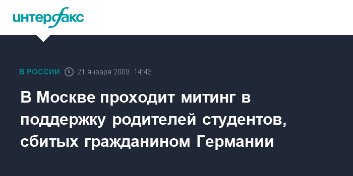 Москва. 21 января. INTERFAX.RU - На юго-западе столицы у здания немецкого посольства в среду днем проходит митинг в защиту родителей двух студентов, которых сбила машина под управлением гражданина Германии, передает корреспондент "Интерфакса".