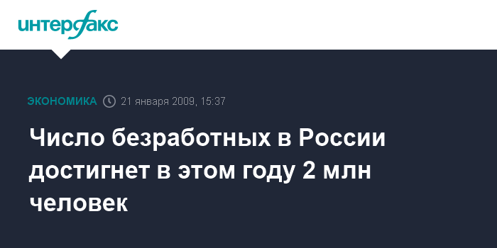 Горки. 21 января. INTERFAX.RU - Минздравсоцразвития РФ прогнозирует, что количество безработных в России в нынешнем году составит порядка двух миллионов человек, сообщила глава ведомства Татьяна Голикова на совещании президента РФ Дмитрия Медведева с полпредами в федеральных округах.